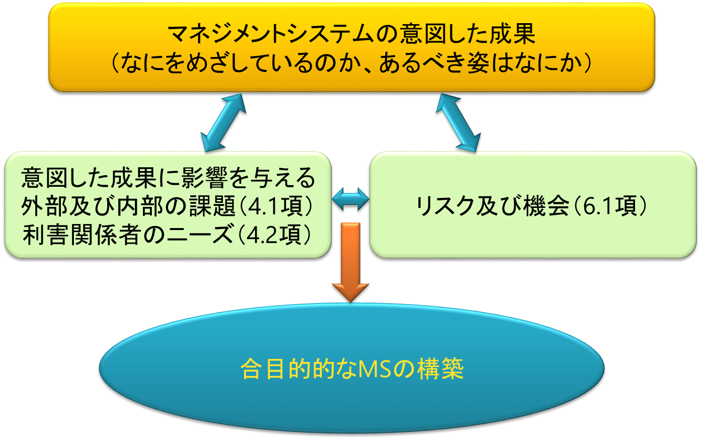 ISOシステム規格の認証制度がはじまった当初は、『ISOを取得していないと取引ができない』という動機の『やらされ感』認証が多くありました。認証制度がはじまって約30年、現在では『取得しているから仕事がくる』という価値は薄くなり、『ISOのために仕事をする』から『ISOをいかに活用する』かに価値観が大きくシフトしています。現在のISO規格の構造自体も、このような価値観饒辺かを受けて、『なんのためのマネジメントシステムなのか(意図した目的)』を明らかにし、その目的を達成するための『課題』や、『利害関係者の期待、ニーズ』、さらには未然防止すべき『リスク』や取り組むべき『機会』を明らかにした上で、これらに整合した一貫性のある、効果的なマネジメントシステムに取り組む概念が導入されています。